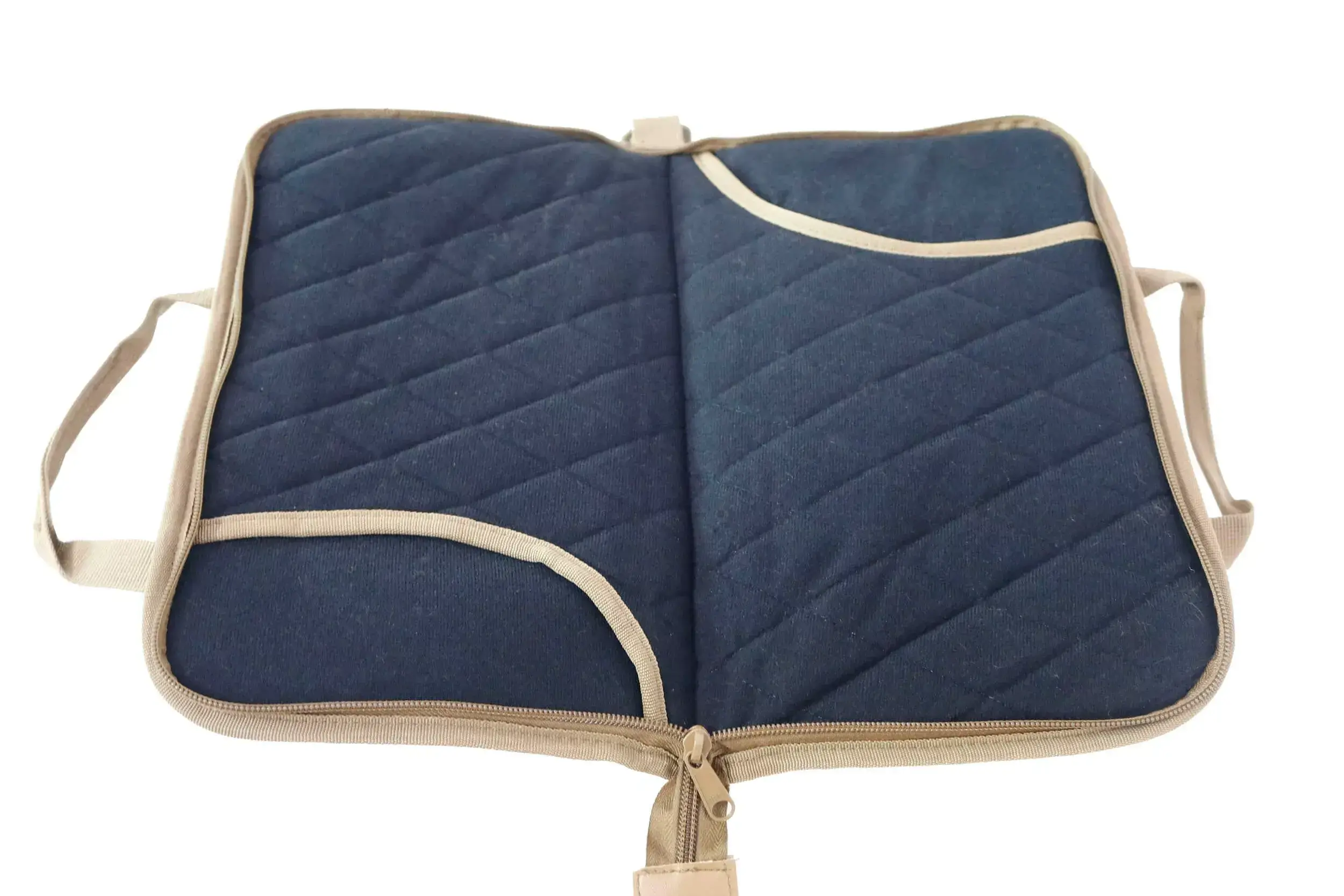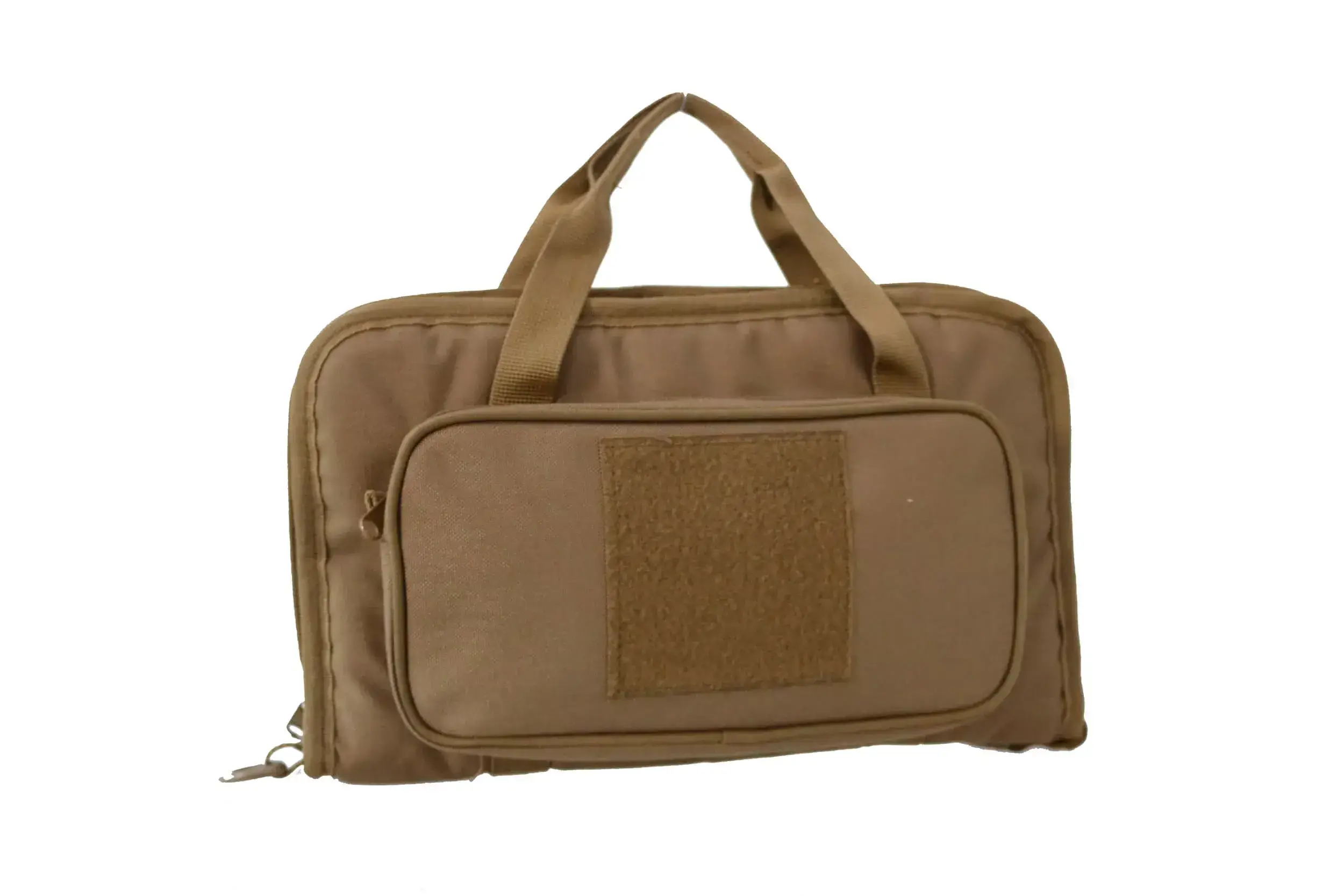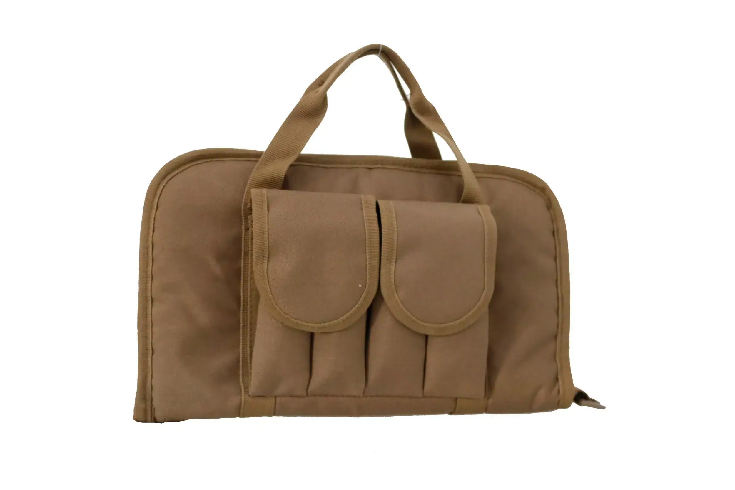 This tan tactical pistol bag features a quilted shock-absorbent padded interior (for handgun protection), a front 4-slot magazine pouch, a velcro patch panel, and a reinforced carry handle—engineered for secure handgun + ammo transport. With a full zip-around design, the bag opens flat for easy access.