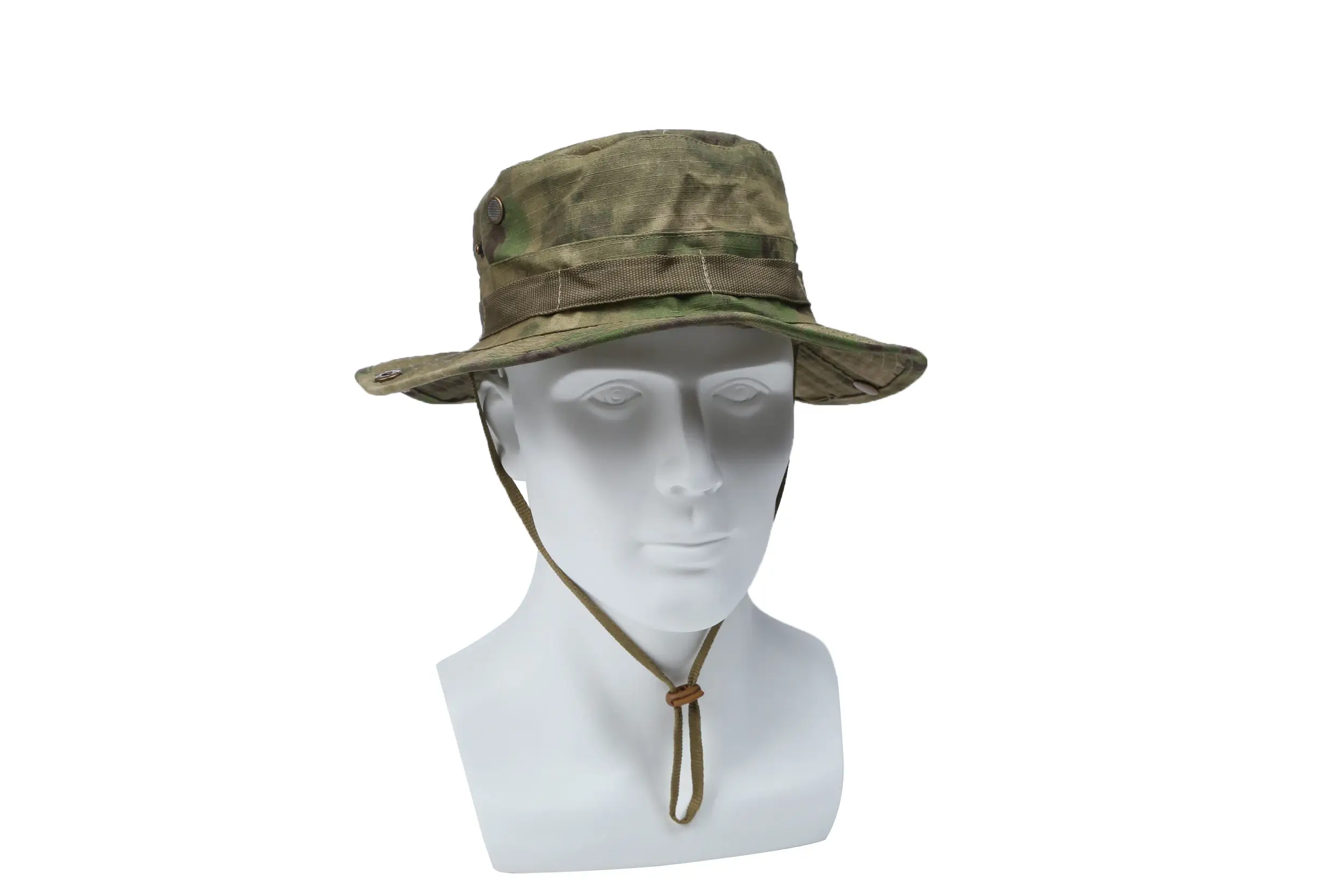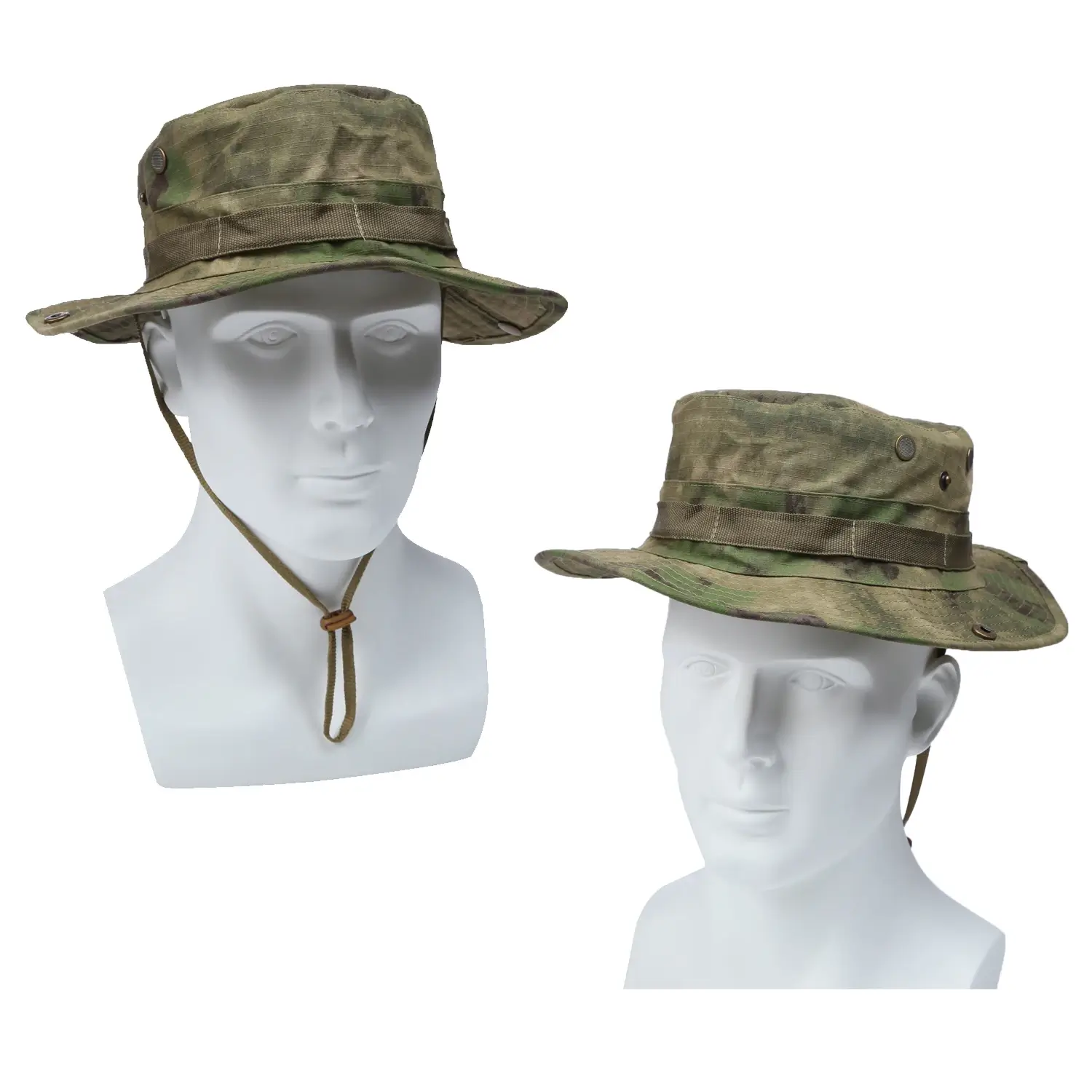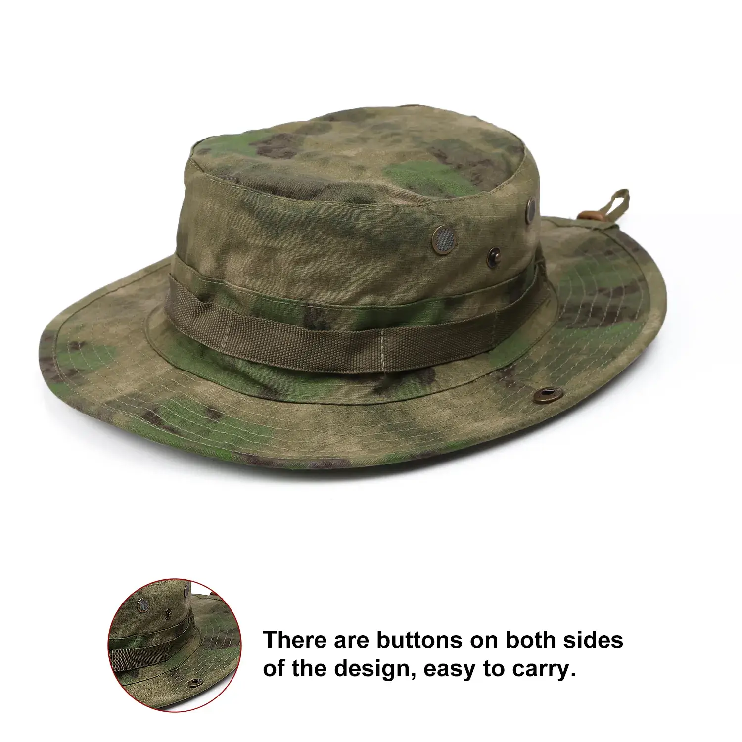 This camo boonie hat offers practical sun protection with its wide, sturdy brim. It has an adjustable chin strap (for a secure fit), 4 meshed brass eyelets (to keep your head cool), and snap buttons to flip brims up (cowboy-style). It’s ideal for sun protection during camping, fishing, or hiking.
