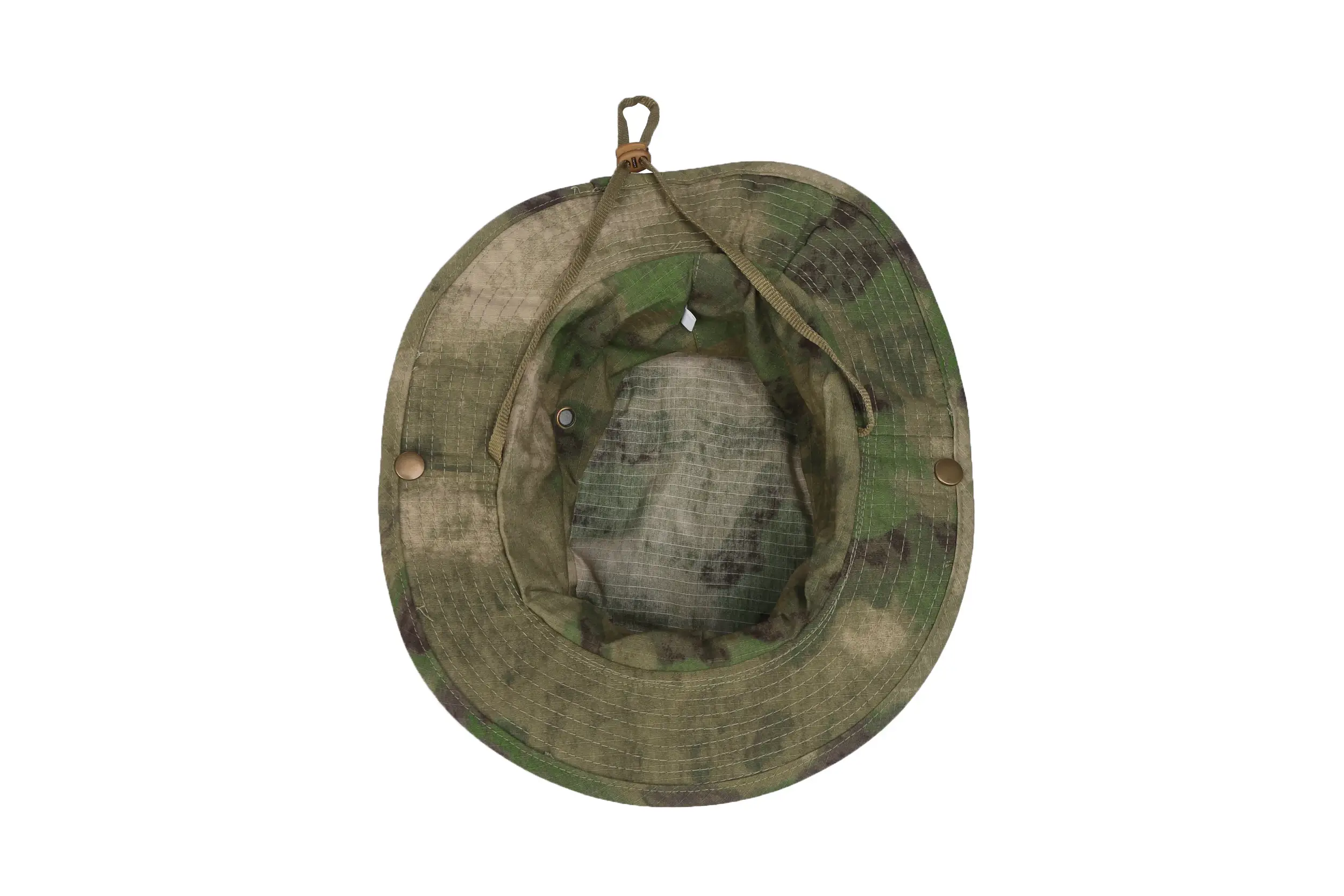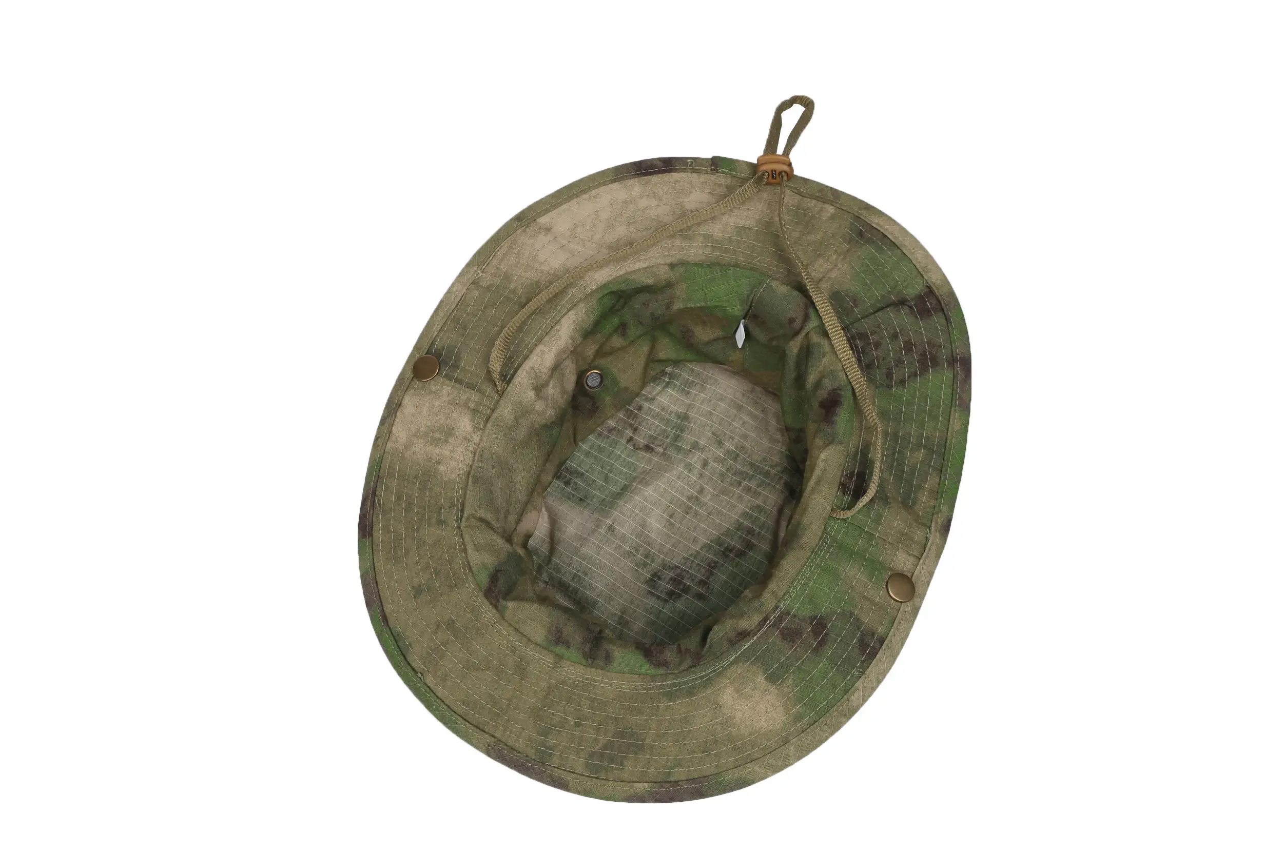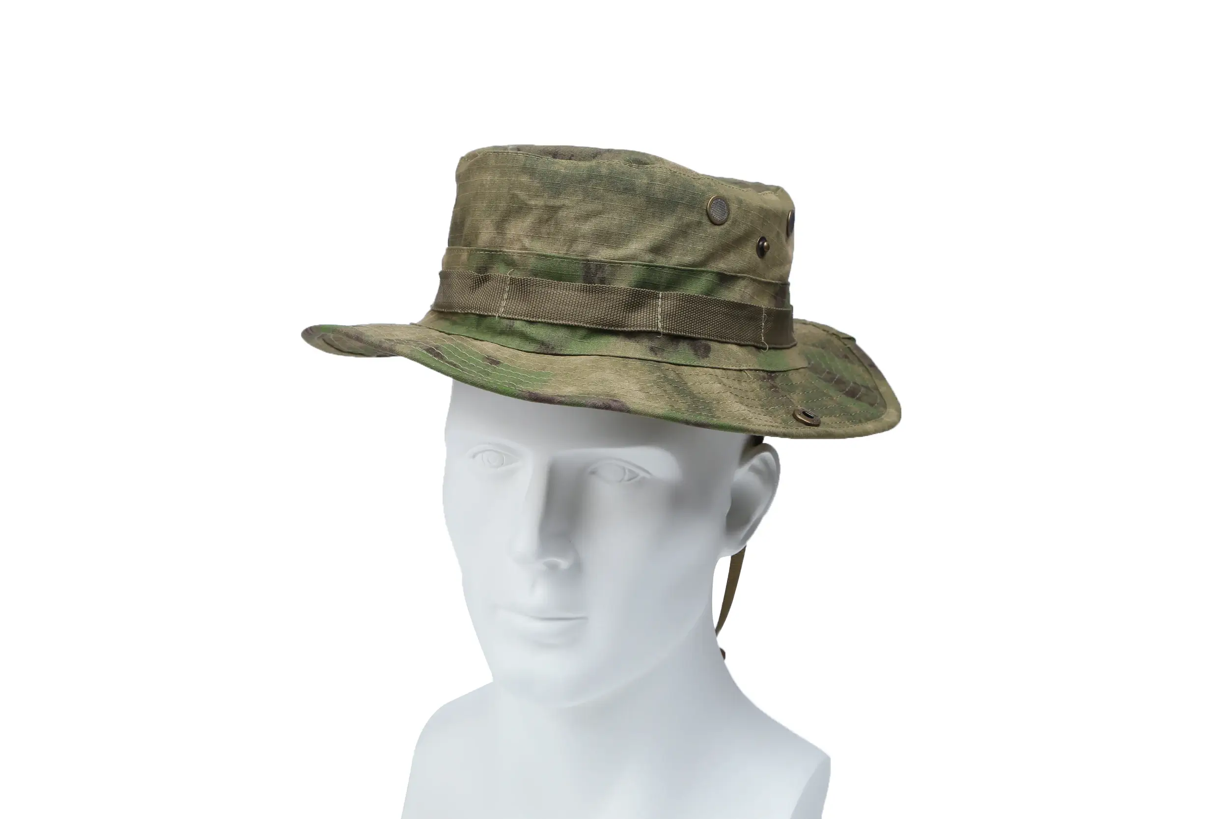 This camo boonie hat offers practical sun protection with its wide, sturdy brim. It has an adjustable chin strap (for a secure fit), 4 meshed brass eyelets (to keep your head cool), and snap buttons to flip brims up (cowboy-style). It’s ideal for sun protection during camping, fishing, or hiking.