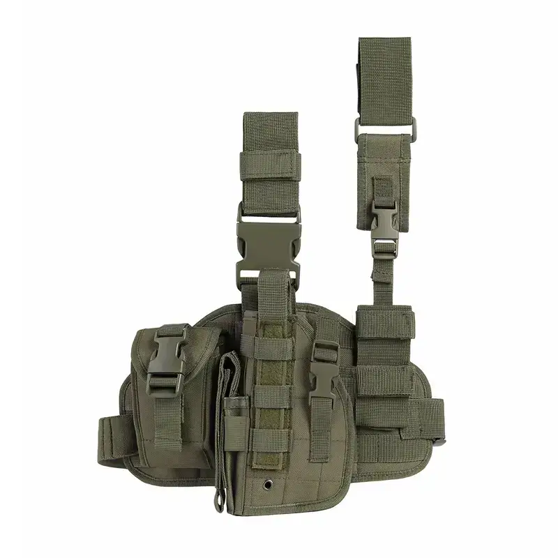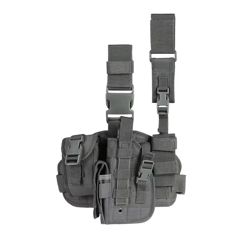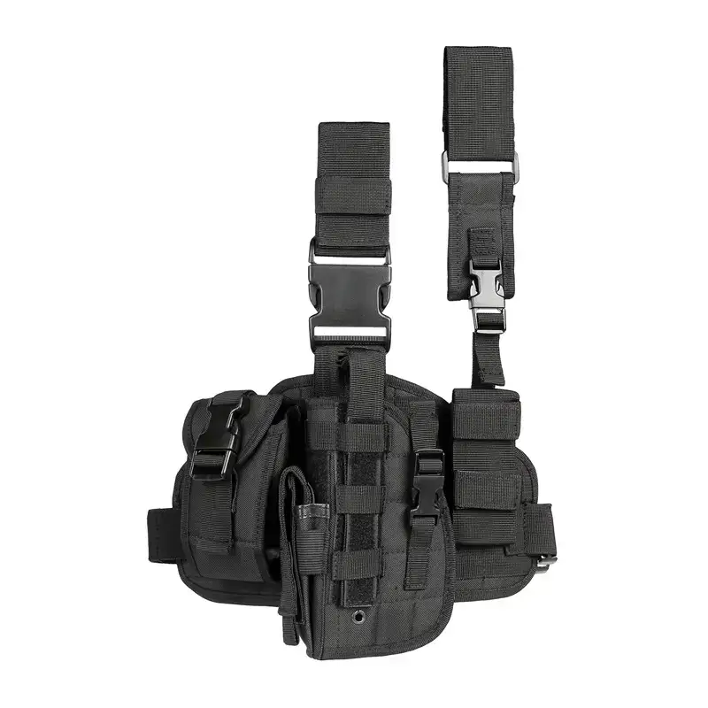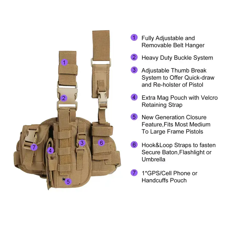 Эта универсальная тактическая кобура предназначена как для правшей, так и для левшей и оснащена системой быстрого извлечения большого пальца. Она включает в себя съемный подсумок для магазинов, ремень для фонарика/зонтика и подсумок для GPS/перчаток, а также полностью регулируемые ремни, подходящие для окружности бедер 19-27 дюймов.