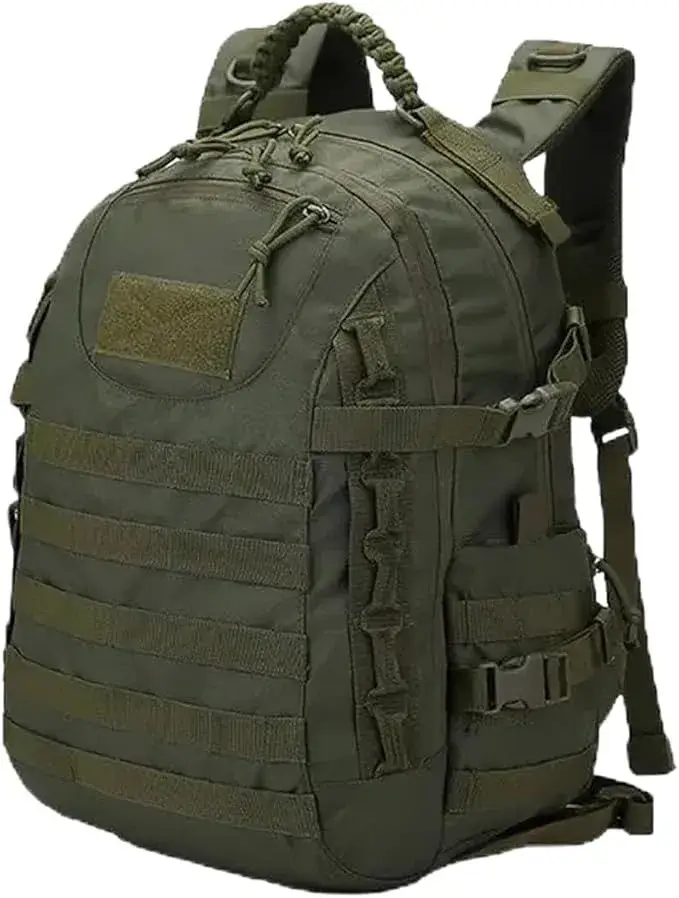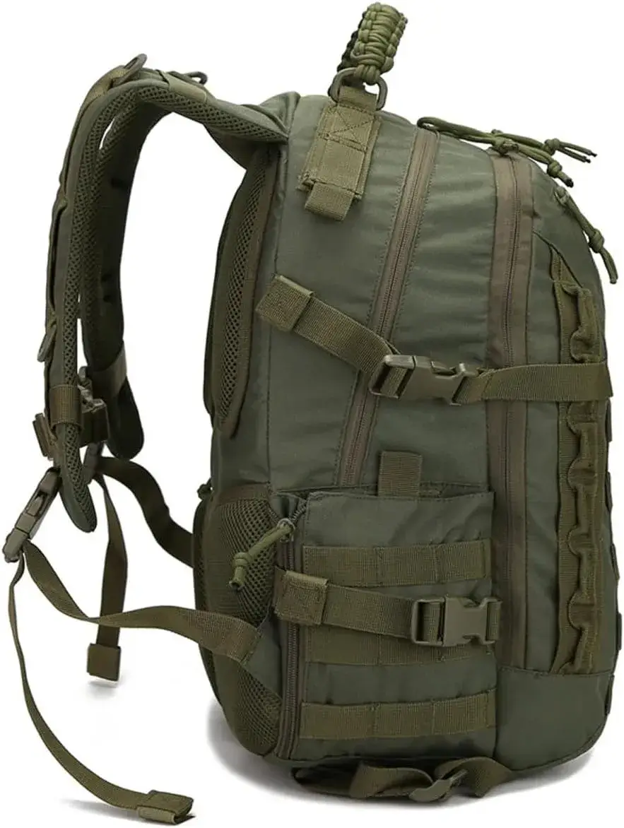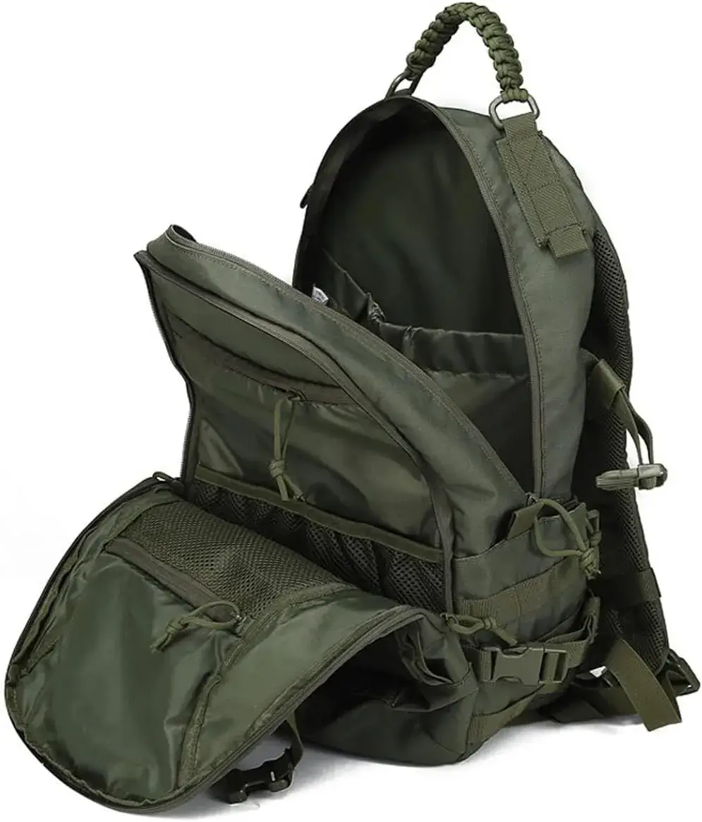 This tactical backpack features MOLLE webbing for attaching pouches, a braided paracord handle (usable as emergency cordage), and breathable mesh padding for all-day comfort.