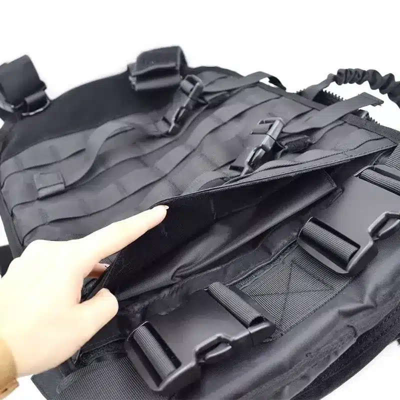 This black 2-in-1 tactical backpack converts directly into a tactical vest/plate carrier via quick-release buckles: it functions as a backpack for gear transport, then transforms into a vest (using its straps and MOLLE panels) for tactical wear—featuring integrated gear attachment points, a front velcro patch, and durable modular construction to balance portability and on-body readiness.