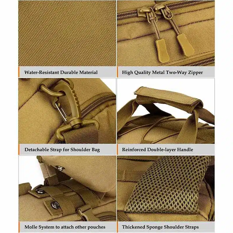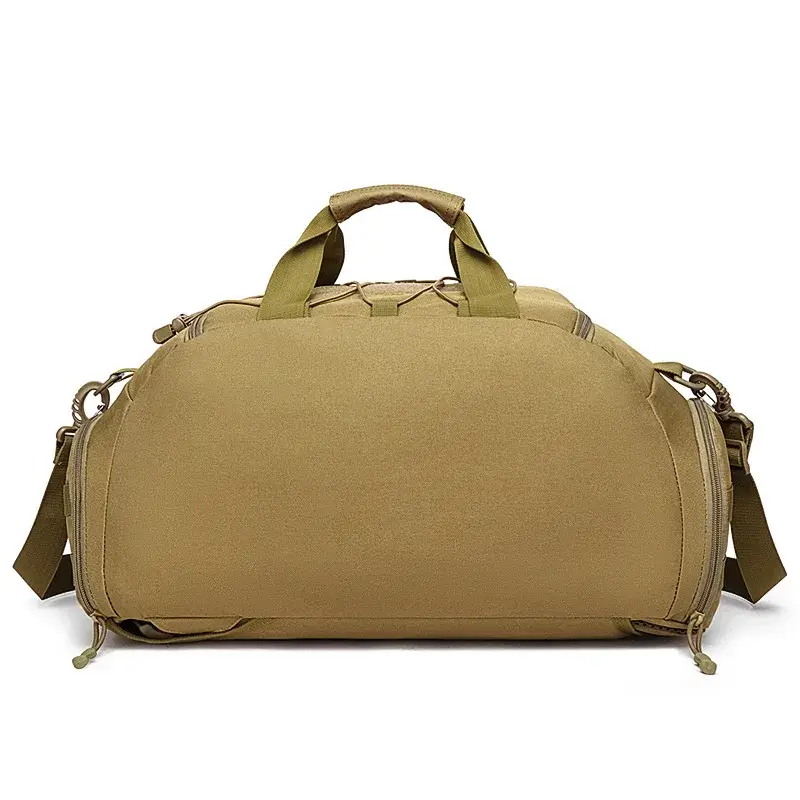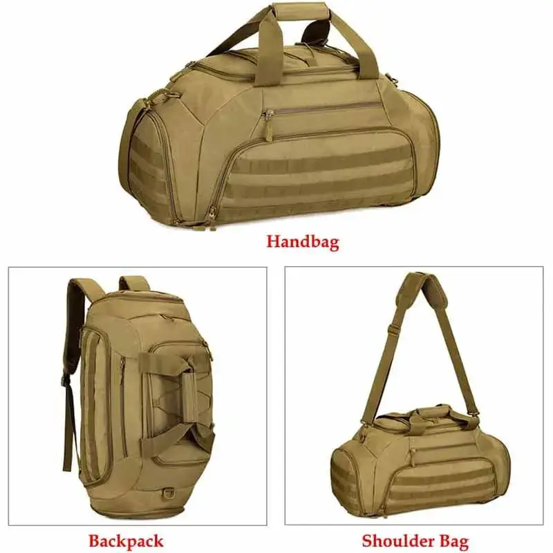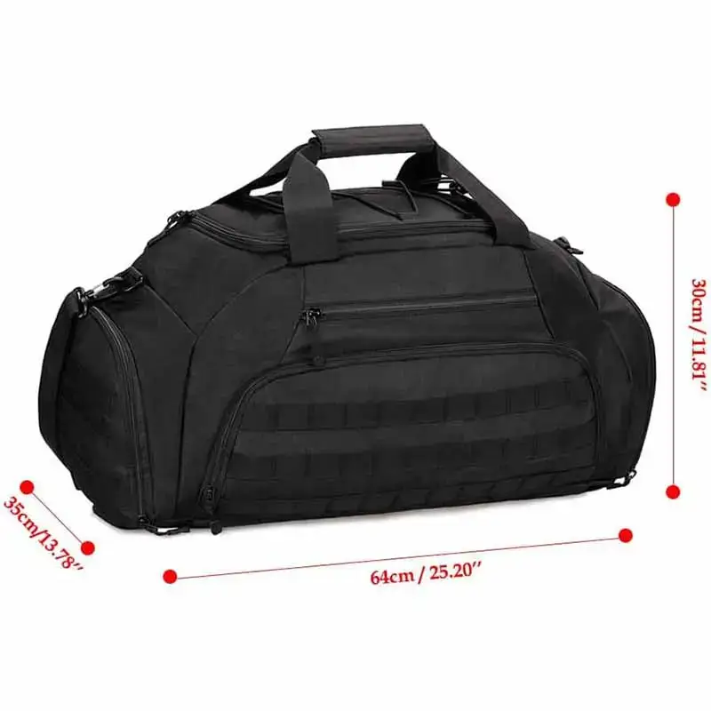 This versatile 3-in-1 tactical bag works as a duffel, backpack, or shoulder bag, featuring a dedicated side shoe compartment to keep footwear separate from your gear. It’s built with water-resistant fabric and MOLLE webbing for attaching pouches, making it perfect for travel, gym, or tactical use.