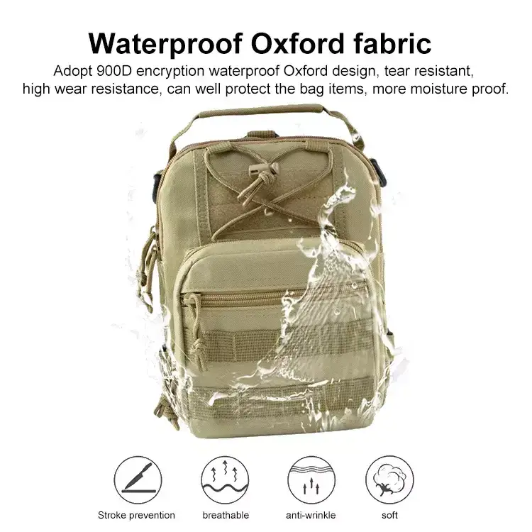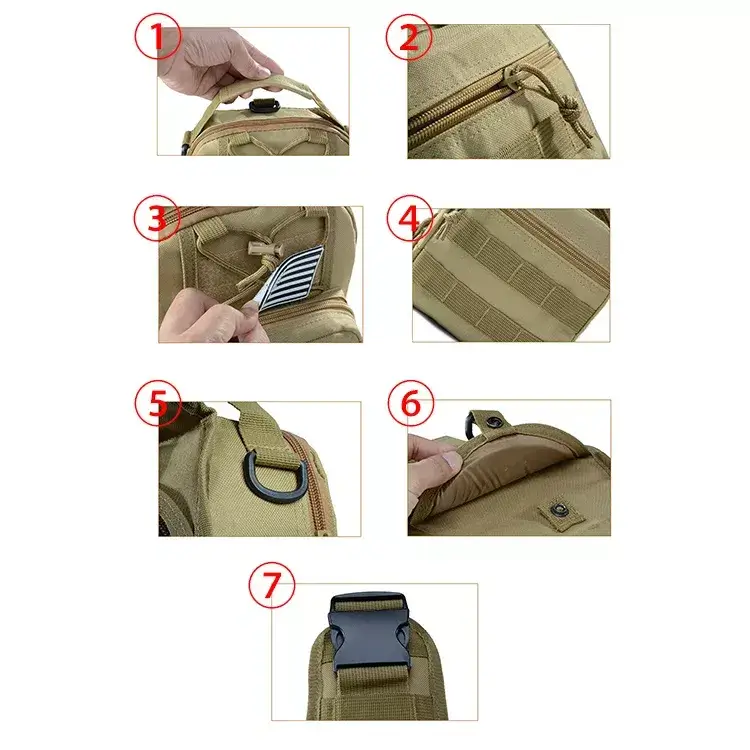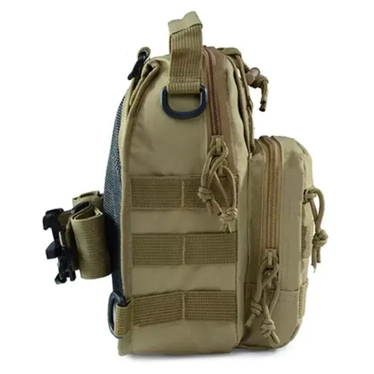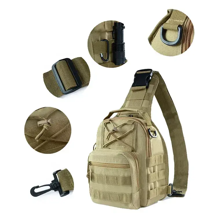 This tactical crossbody sling bag has a compact design, ideal for carrying essential gear in a lightweight and accessible way. With MOLLE webbing on the front and side, you can attach extra pouches or accessories as needed. The main compartment has multiple zippered pockets for organizing smaller items, while the exterior elastic drawstring provides quick access to frequently used gear.