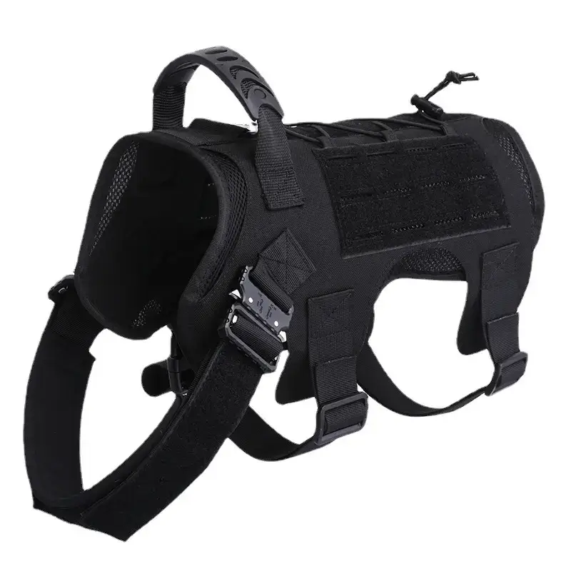 This modular tactical dog vest functions as both a secure vest and gear carrier: it features MOLLE webbing for K9/pet essentials, breathable mesh lining, quick-release buckles, a top grab handle, and adjustable straps—built for K9 duty, outdoor adventures, or everyday walks, with optional pouches to store treats, tools, or waste bags.